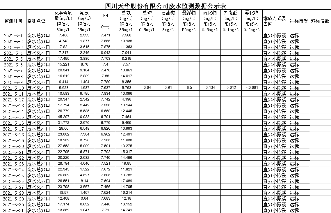 四川天华富邦化工有限责任公司5月废水监测数据公示