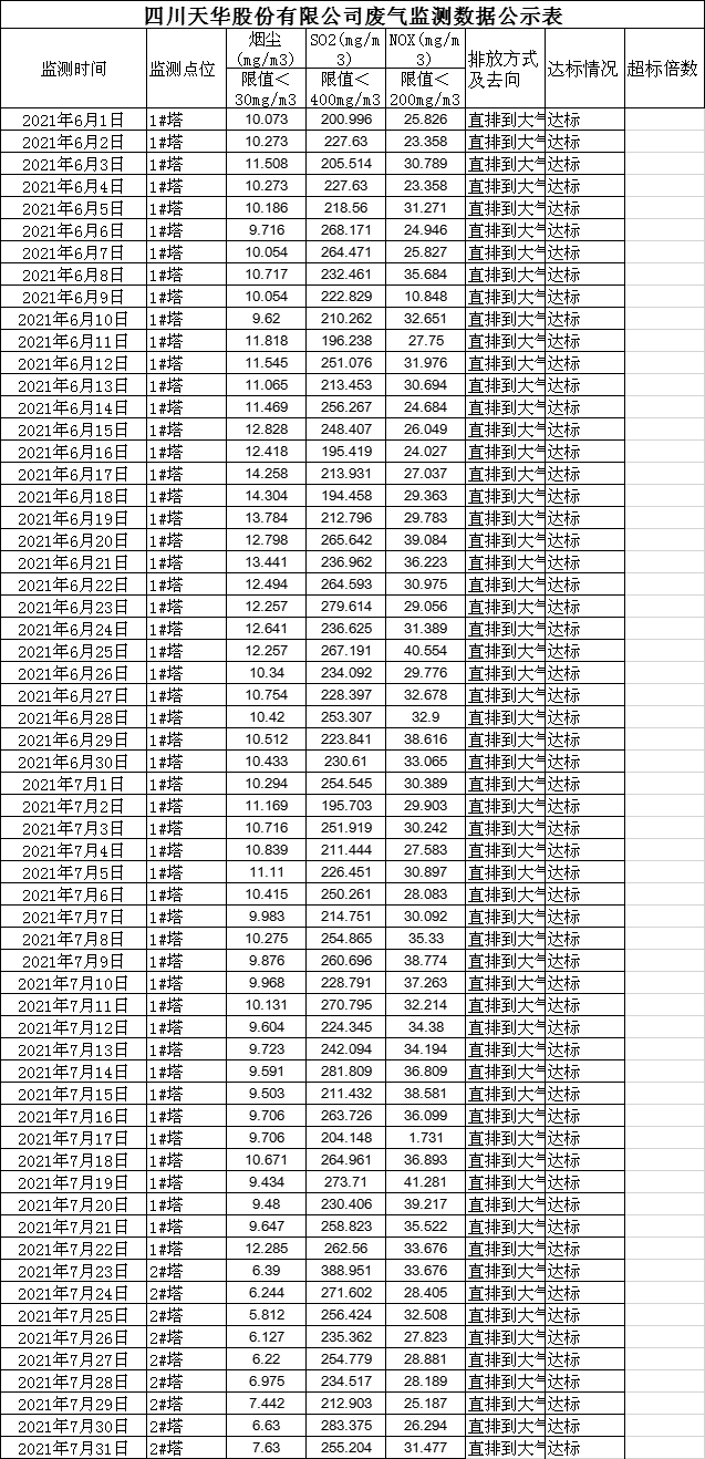 四川天华富邦化工有限责任公司6月、7月废水监测数据公示