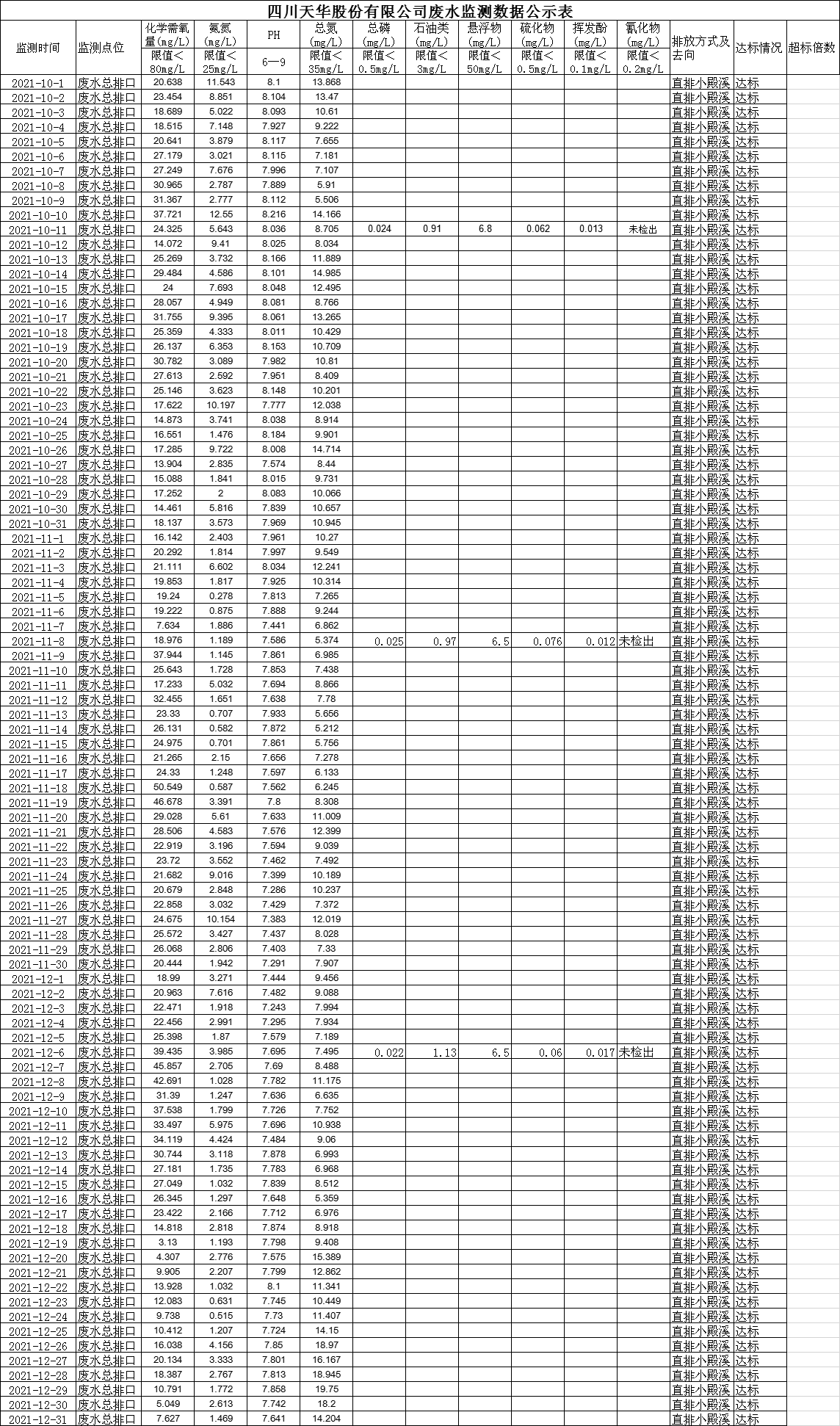 四川天华富邦有限责任公司10月11月12月废水监测公示