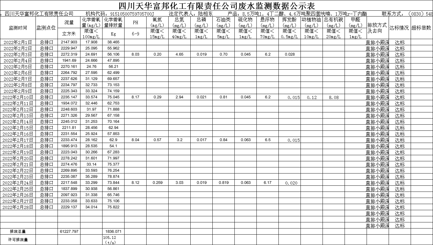 四川天华富邦化工有限责任公司2022年2月废水监测数据公示