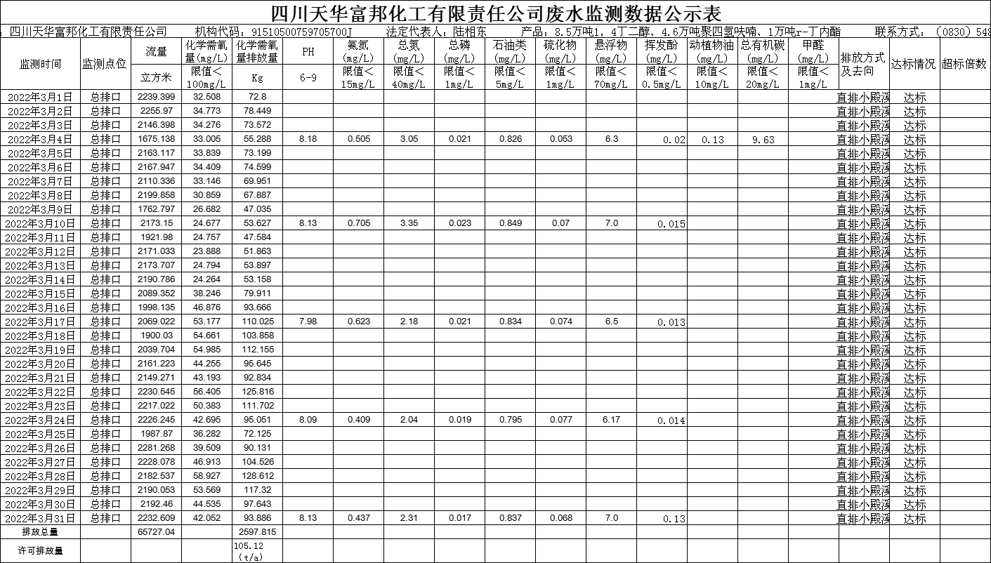 四川天华富邦化工有限责任公司2022年3月废水监测数据公示