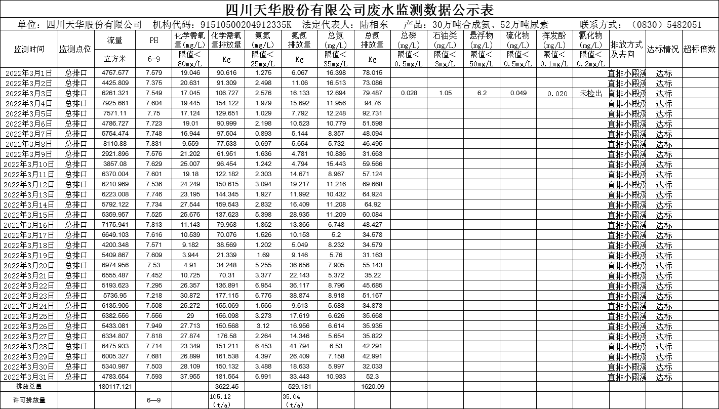四川天华富邦化工有限责任公司2022年3月废水监测数据公示