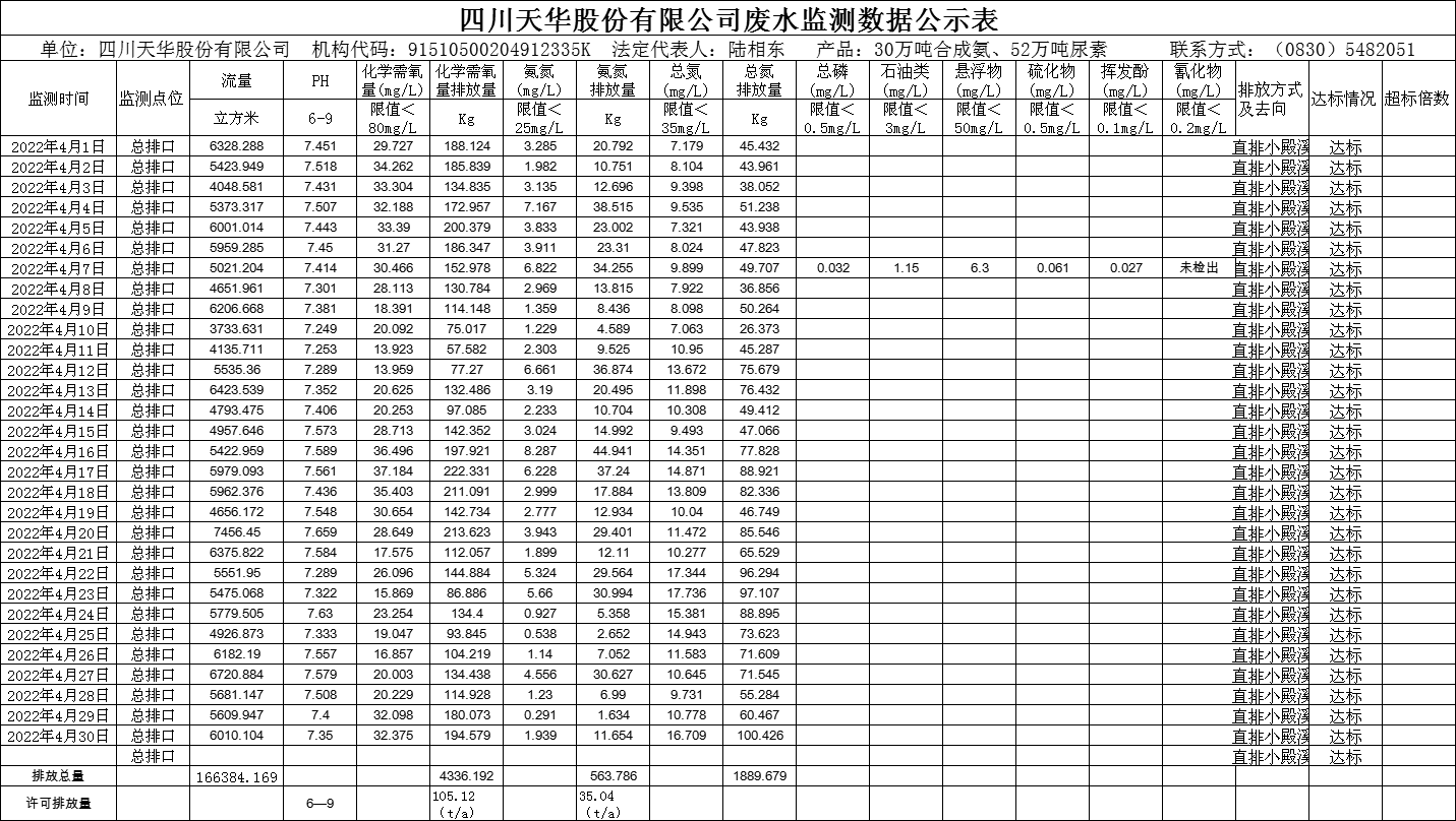 四川天华富邦化工有限责任公司2022年4月份废水监测数据公示