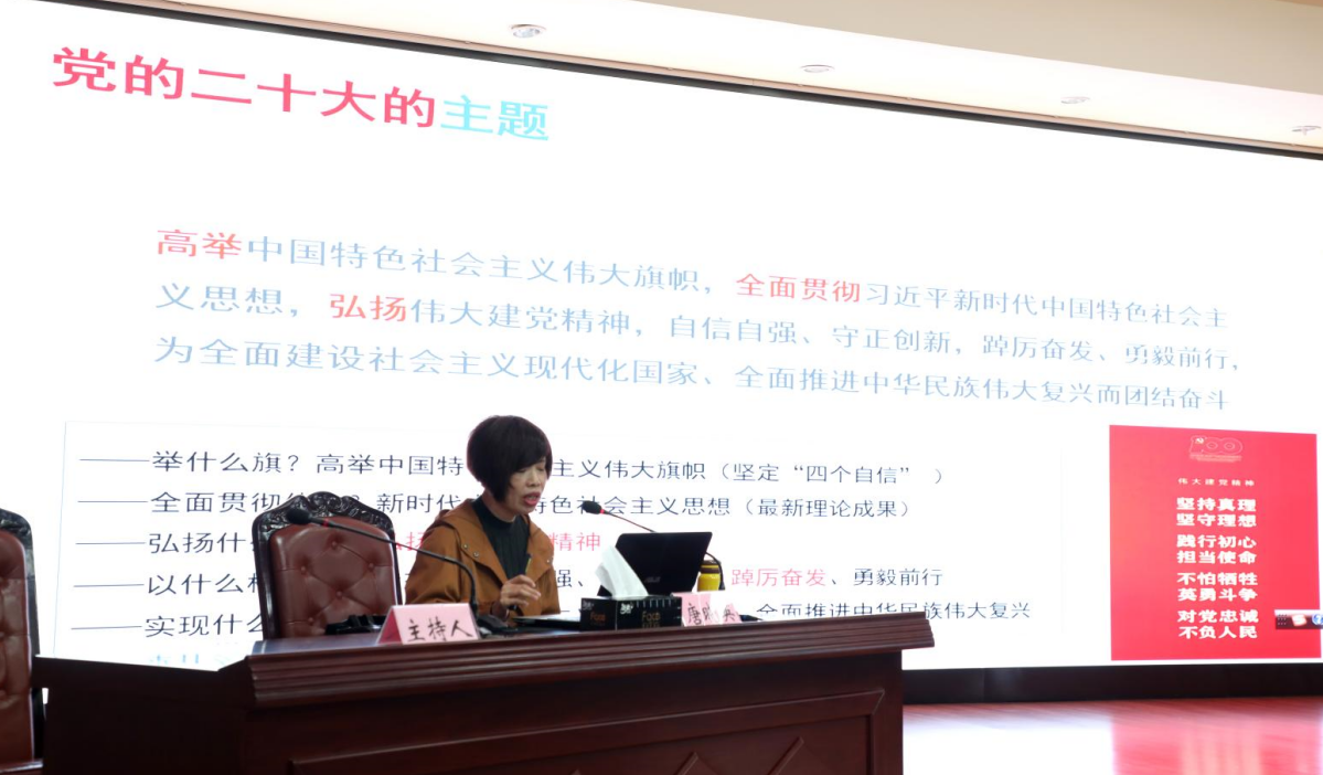 唐晓英从深刻把握党的二十大的主题和主要成果、深刻把握过去5年的工作和新时代10年的伟大变革、深刻把握开辟马克思主义中国化时代化新境界的历史责任、深刻把握以中国式现代化全面推进中华民族伟大复兴的使命任务、深刻把握全面建设社会主义现代化国家的目标任务、深刻把握加强党的全面领导和全面从严治党的部署要求、深刻把握应对风险挑战的重要要求、坚定推动党的二十大决策部署在四川落地生根等方面,对党的二十大精神进行了系统宣讲和详细阐述。